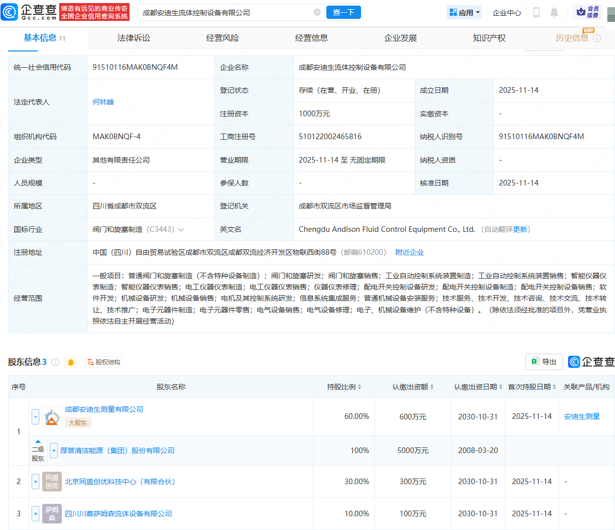 近日,成都安迪生流体控制设备有限公司成立网上配资炒股门户,法定代表人为何林峰,注册资本为1000万元,经营范围包含:阀门和旋塞研发;工业自动控制系统装置制造;智能仪器仪表制造;电工仪器仪表制造等。企查查股权穿透显示,该公司由厚普股份(300471)全资子公司成都安迪生测量有限公司、北京同盛创优科技中心(有限合伙)等共同持股。